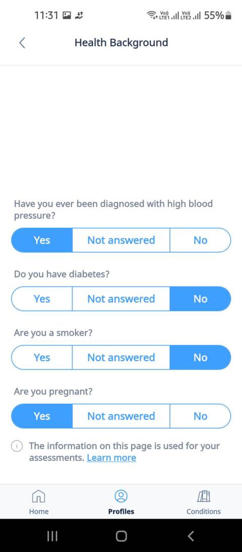 The app begins by asking for basic information such as your gender, age, and whether you have any pre-existing diseases like hypertension or high cholesterol. You can also add any other symptoms you’re having, such as weariness, chills, or dizziness.
